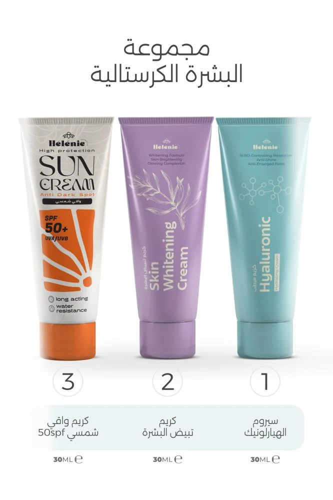 هل ترغبين في بشرة نقية، ناعمة ومحمية طوال اليوم؟ مع مجموعة هيليني للبشرة الكريستالية، يمكنكِ الحصول على روتين متكامل يشمل كريم الهيالورونيك المرطب، كريم تبييض البشرة، وكريم واقي شمسي SPF 50، ليمنحك بشرة صحية، مشرقة، وواقية من أشعة الشمس الضارة.